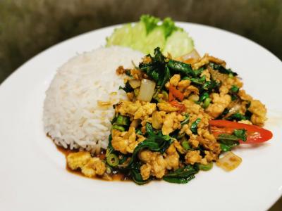 ผัดกระเพรา ไก่ หมู เนื้อ กุ้ง ปลาหมึก ทะเล