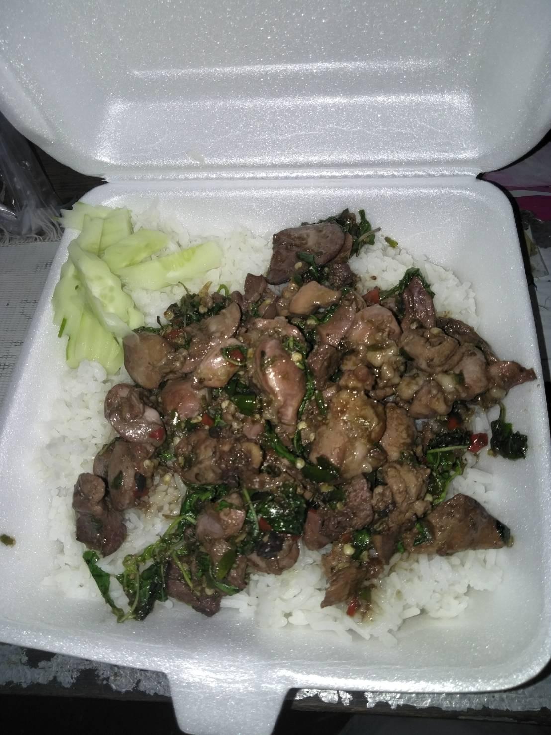 ผัดกระเพราเครื่องในไก่ ราดข้าว ธรรมดา 40 พิเศษ 50 กับข้าว 60