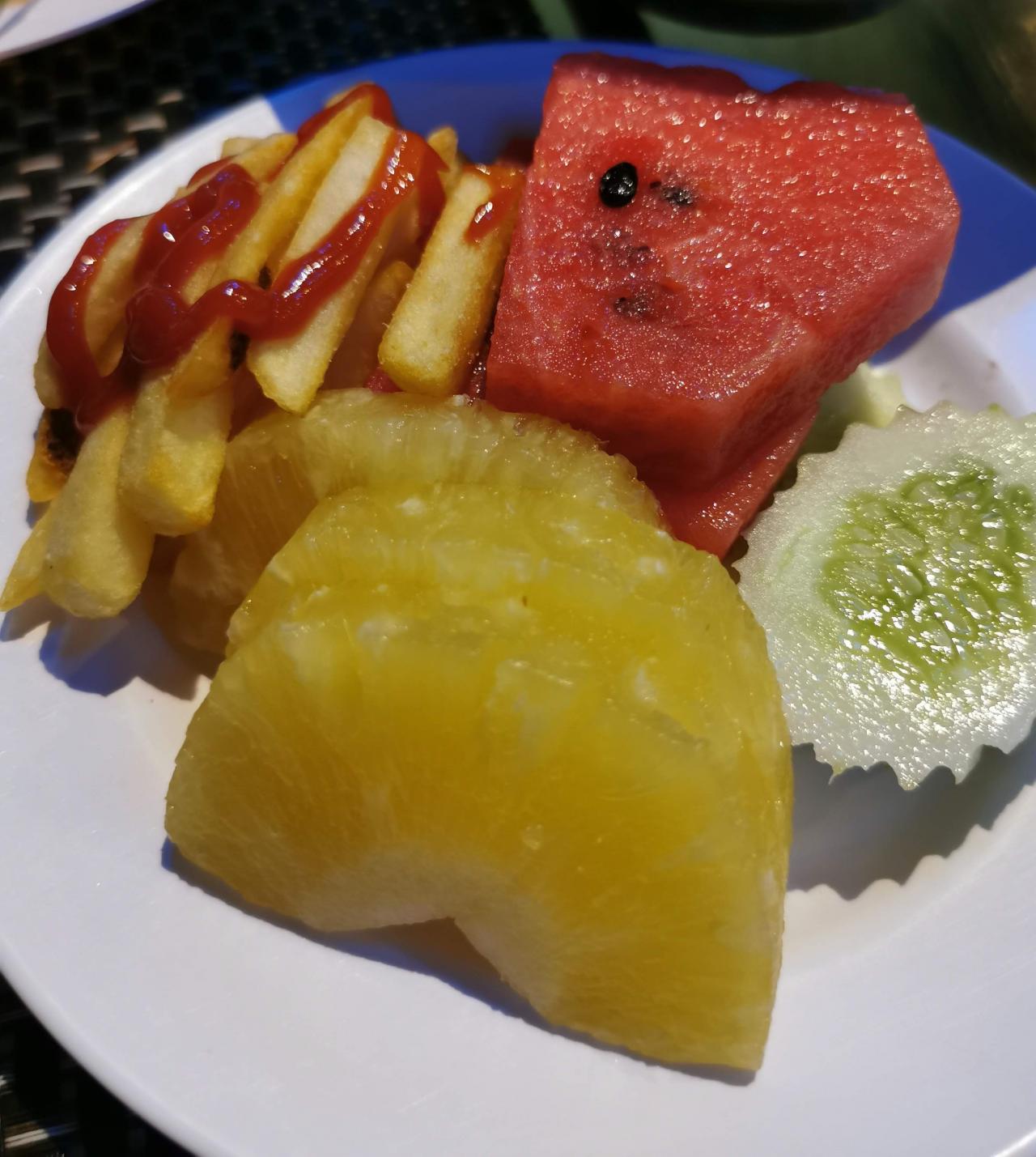 ช่วงเวลาที่ถ่ายรูปนี้เป็นช่วง 16.30น. นะครับ พระอาทิตย์กำลังจะตก ต้องบอกว่าที่ผมนั่งตรงนี้รู้สึกว่ามันจะร้อนมาก โดนแดดแบบเมืองไทยส่องเข้ามาเต็ม ๆ เพราะพระอาทิตย์ส่องลงทะเลแล้วสะท้อนเข้ามา ตรงนี้ลมก็ไม่เข้า มีแต่พัดลมของทางร้านที่ความแรงไม่สามารถพัดไขมันในตัวผมออกไปได้เท่าที่ควร