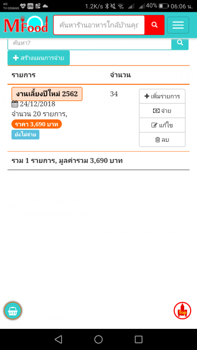 จากนั้นหน้าจอจะแสดงปุ่มชำระค่าอาหารขึ้นมา