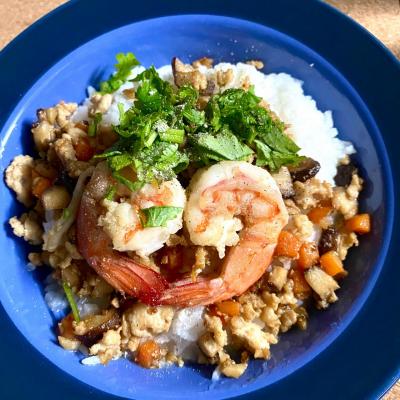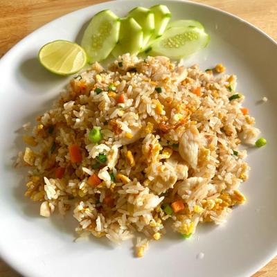 ข้าวต้มแห้งใส้ไก่และกุ้ง [ Dry Rice Porridge with chicken and prawn(or with out) ]