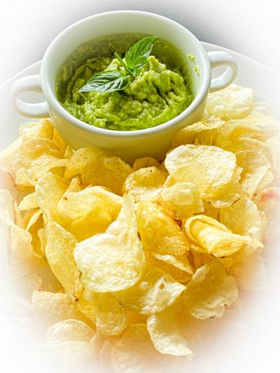 มันฝรั่งแผ่นทอดกรอบทานคู่กับซอสครีมอโวคาโด [ Chips with Guacamole ]