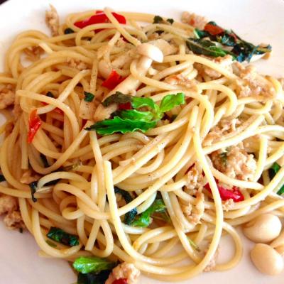 ผัดกระเพราสปาเก็ตตี้ไก่[ Stir-fried chicken with Thai Basil on spaghetti ]