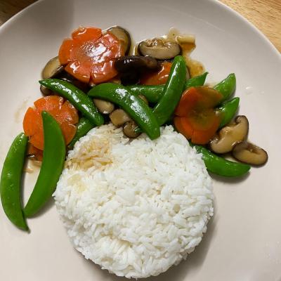 ผัดถั่วลั่นเตาไก่ เห็ดหอม( Stir-fried sweet pea with chicken and mushroom or vegetarian)